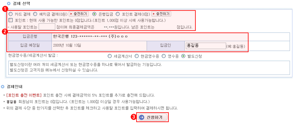결제선택 : 서비스 신청에 대한 결제방법을 선택하는 필드입니다. 카드결제/은행입금/예치금의 결제 수단을 선택하실 수 있습니다.
