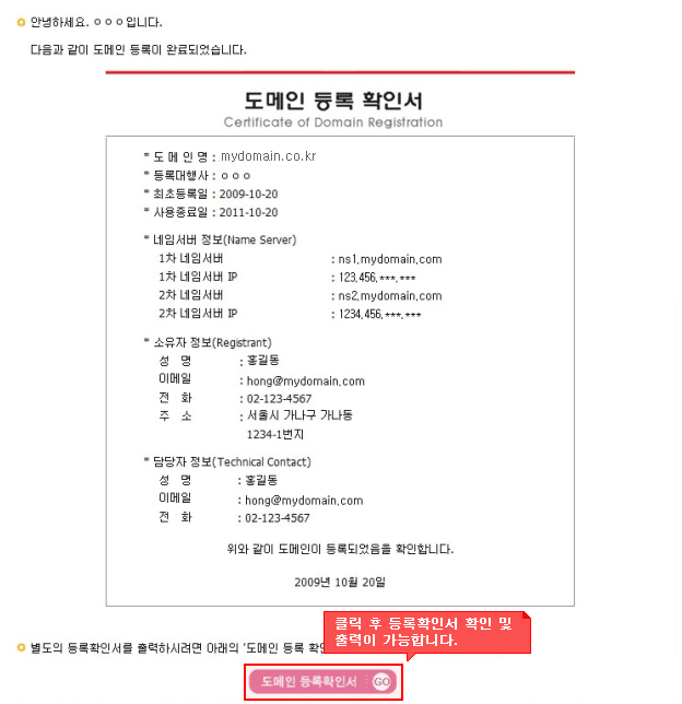 도메인 등록 확인서 : 도메인 등록완료 메일의 도메인 등록확인서 버튼을 클릭하시면 아래와 같은 도메인 등록확인서를 확인하실 수 있으며 인쇄하기를 클릭해