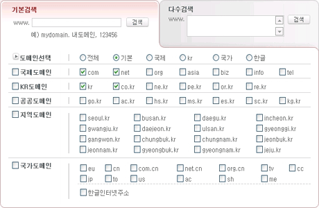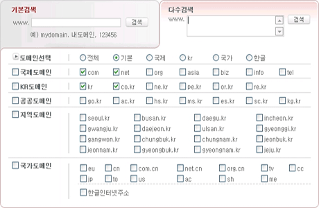 다수검색 : 한글/영문 도메인 검색 시 COM/NET/KR 도메인을 위주로 검색하여