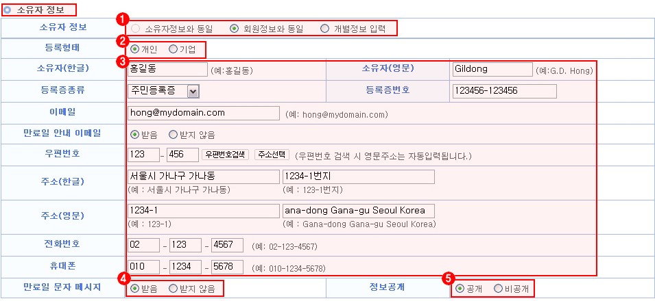 (1) 신청 서비스의 소유자 정보를 회원정보와 동일 또는 다른으로 설정하는 기능입니다.