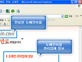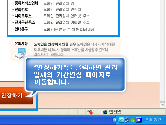 도메인이름이 만료된 후 도메인이름의 네임서버 정보를 변경하여 연장유효일 30일 동안 웹페이지를 통해 기간연장을 신청할 수 있도록 안내하는 서비스입니다. 연장안내 자동접속 페이지에 접속하면 도메인 관리기관 및 연락처를 확인할 수 있으며 기간연장 버튼을 클릭해 바로 기간연장을 신청하실 수 있습니다.