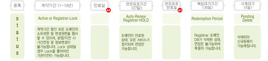 도메인 만료주기의 상태는 도메인정보조회를 통해 확인할 수 있습니다. 도메인의 최초 등록 시 Active 상태에서 만료일에 따라 도메인 상태(Status)가 변화하게 되며, 국가도메인의 경우 ICANN의 도메인 정책을 기본으로 해당 국가의 도메인 관리기관에서 확립한 도메인 정책에 의해 운영됩니다. 해당 국가 도메인의 정책은 관리기관에 따라 차별적으로 운영되며 도메인의 만료주기 또한 해당 국가의 정책에 의해 차별적으로 운영되고 있습니다. 몇몇 국가도메인의 경우 도메인 소유자 정보를 공개하지 않는 경우도 있습니다.