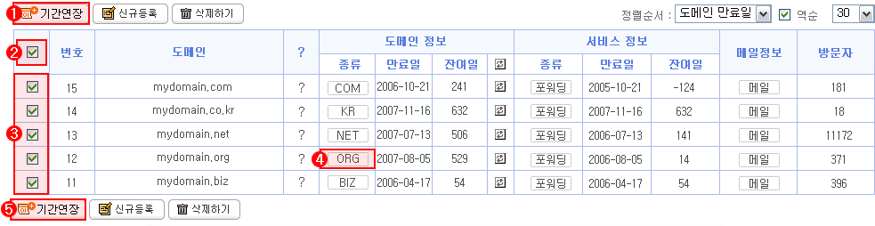 도메인의 목록에서 기간연장을 신청할 경우 도메인의 만료일 및 잔여일을 검색해 일괄적인 기간연장 신청이 가능합니다.