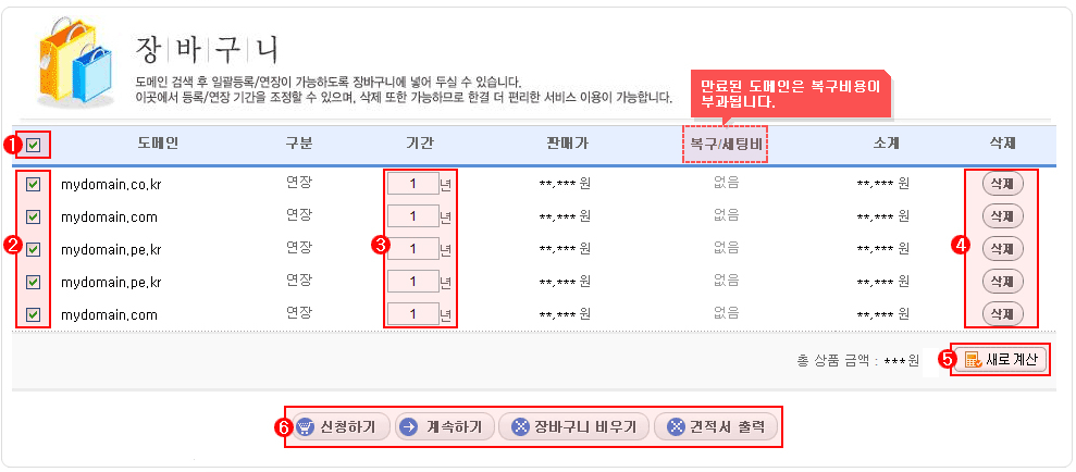 - 내도메인에서 도메인을 선택한 후 기간연장을 클릭하면 장바구니 페이지로 이동합니다. 장바구니에서는 도메인 목록 및 판매가/기간을 수정하실 수 있으며, 신청된   서비스를 개별적으로 삭제하실 수 있습니다.