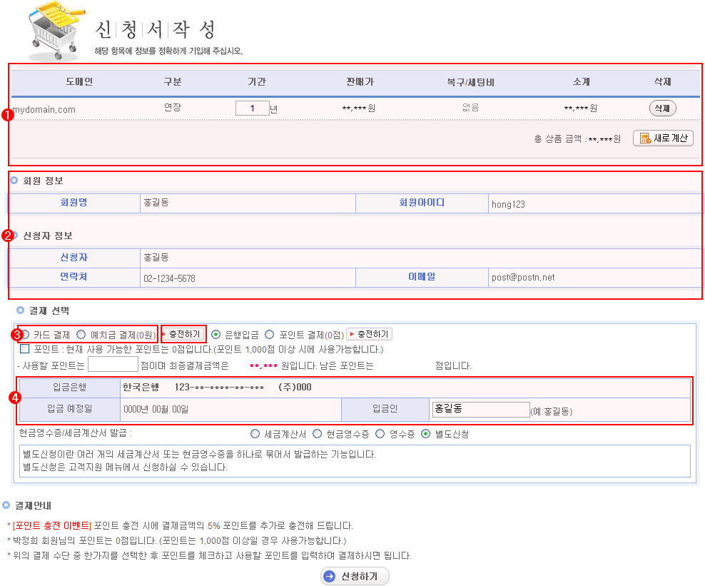 (1) 도메인 서비스의 신청내역과 이용요금을 확인하실 수 있습니다.