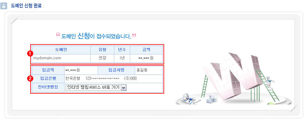 은행입금 접수완료 : 은행입금으로 신청했을 경우 아래와 같은 완료 페이지로 접속이 이루어지며 도메인의 소유자 이메일로 도메인 신청접수 메일이 발송됩니다.