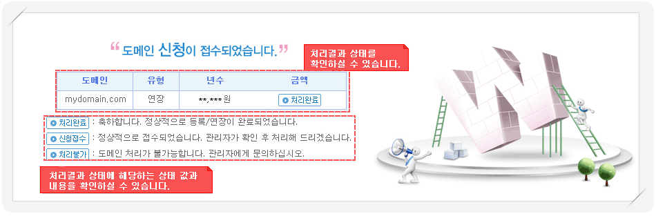 처리완료 : 도메인 등록이 완료된 상태입니다. 내도메인 또는 내정보의 도메인 목록에서 등록된 도메인을 확인하실 수 있으며, 도메인정보조회를 통해 등록된 도메인 정보를