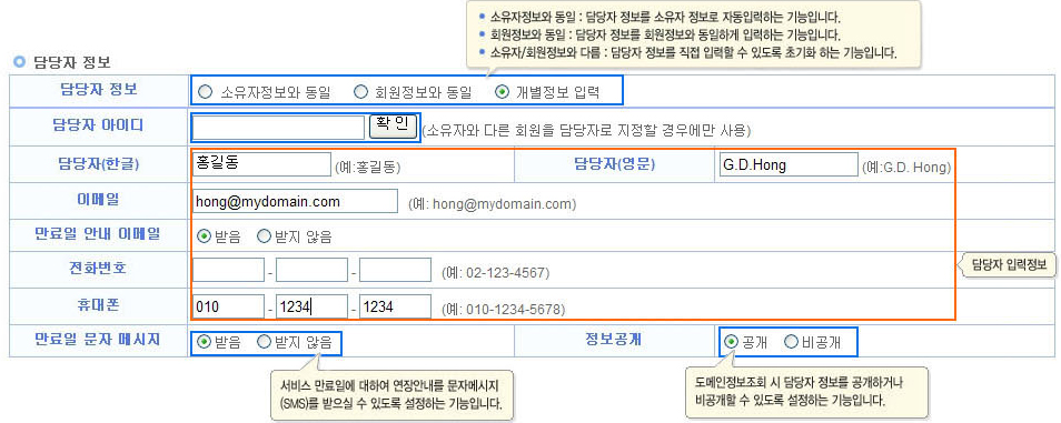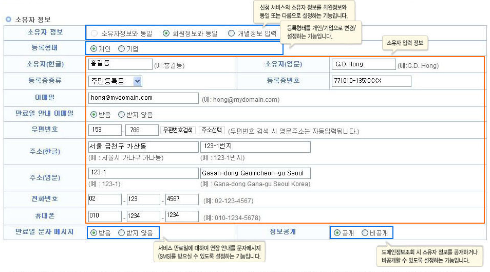 (3) 소유자 정보 : 신청하신 서비스에 대한 소유자 정보를 입력하는 필드입니다. 소유자 정보는 해당 서비스에 대한 소유권을 행사할 수 있는 소유자의 정보를 입력하는                            필드이므로 정확히 입력하셔야 합니다.