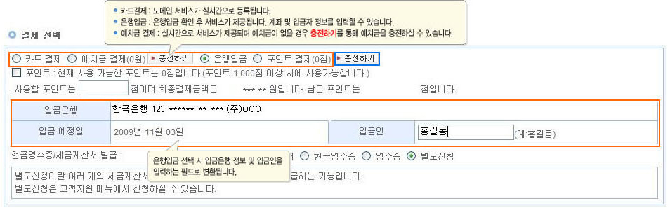 (5) 결제선택 : 서비스 신청에 대한 결제방법을 선택하는 필드입니다. 카드결제/은행입금/예치금의 결제 수단을 선택하실 수 있습니다.