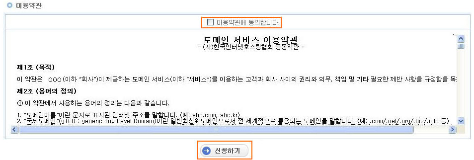 (6) 이용약관 : 신청한 서비스에 대한 이용약관을 확인하실 수 있는 필드입니다. “이용약관에 동의합니다.”를 선택 하신 후 신청하기를 클릭해 서비스를 신청해 주시기 바랍니다.