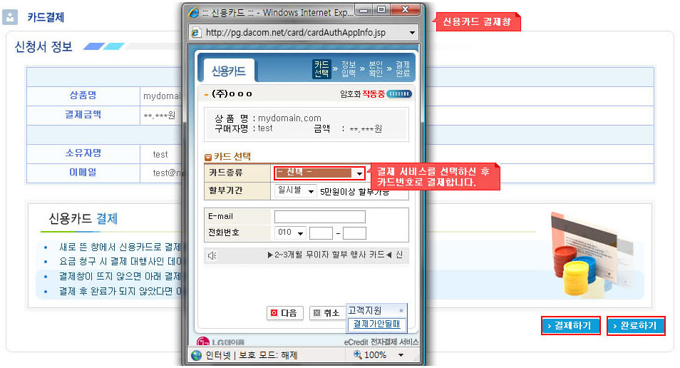 (2) 신용카드 결제 : 신청서의 결제선택에서 신용카드 결제를 선택했다면 다음과 같은 페이지로 접속하게 됩니다.